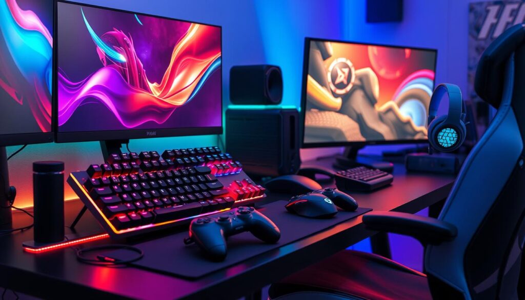 Building your ultimate gaming setup means focusing on high performance gaming accessories. These include high-refresh-rate monitors and ultra-wide screens. They can greatly improve your gaming experience.